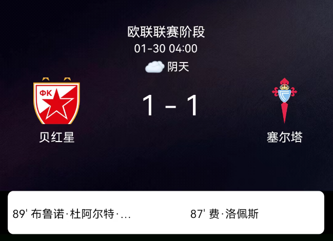 北京时间1月30日,欧足联欧洲联赛阶段第8轮,贝尔格莱德红星主场对阵塞尔塔。第87分钟费尔-洛佩斯破门0-1;第89分钟布鲁诺-杜阿尔特破门1-1;双方无红黄牌。最终比分,贝尔格莱德红星1-1塞尔塔。