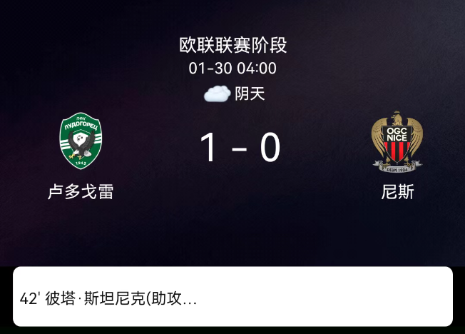 北京时间1月30日,欧足联欧洲联赛阶段第8轮,卢多戈雷茨主场对阵尼斯。第42分钟斯塔尼奇破门1-0;双方无红黄牌。最终比分,卢多戈雷茨1-0尼斯。